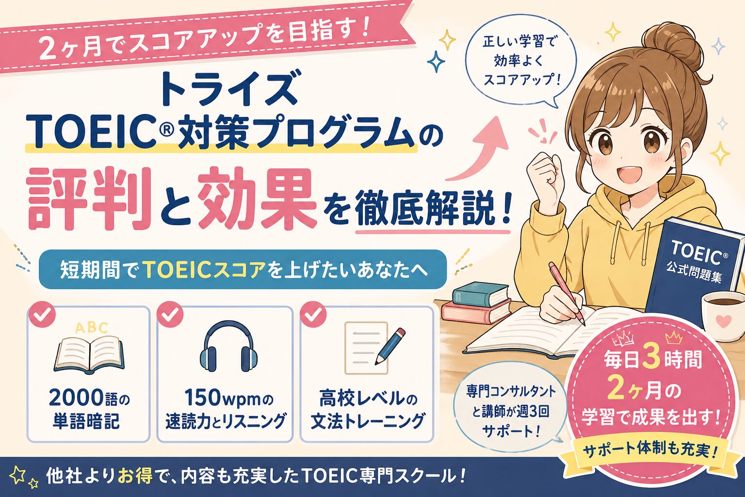 トライズTOEIC対策プログラムは、短期間でTOEICスコアアップを目指すための専門プログラムです。